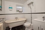 Family Bathroom Obscure window to the rear aspect inset lighting slipper bath w.c wash hand basin with vanity unit heated towel rail part tiled walls and tiled flooring.