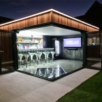 built garden room, with floating corner bi fold doors, feature mirror wall to rear of bar area, gym area, ideal for use as home office.
