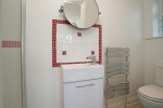 Cloakroom with obscure window to the side aspect, boiler cupboard with combi boiler and underfloor heating manifold, w.c, wash hand basin inset lighting with tiled flooring.