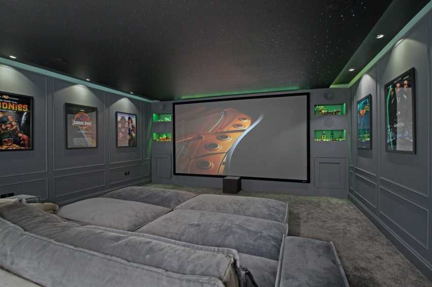 The fully fitted cinema room also has bi fold doors with inset blinds leading onto the patio, fully panelled feature walls full width cinema screen and projector, and feature star light ceiling with sound system.